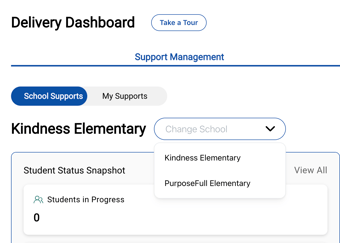 - Within your support management and student dashboard, there will be an option to toggle or switch between the different schools.
